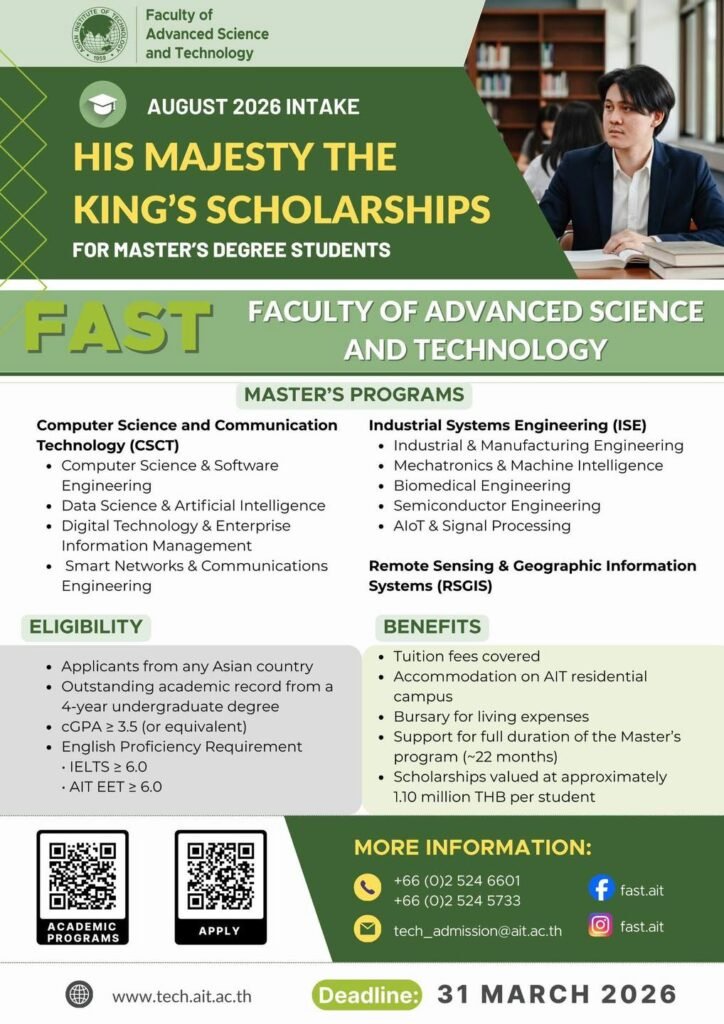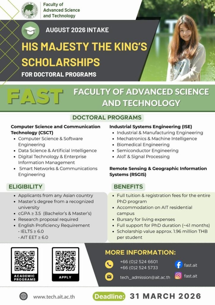 Asian Institute of Technology ရဲ့ @Faculty of Advanced Science and Technology ကနေ Full Scholarship တွေခေါ်ယူနေပါတယ်။