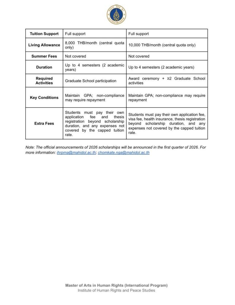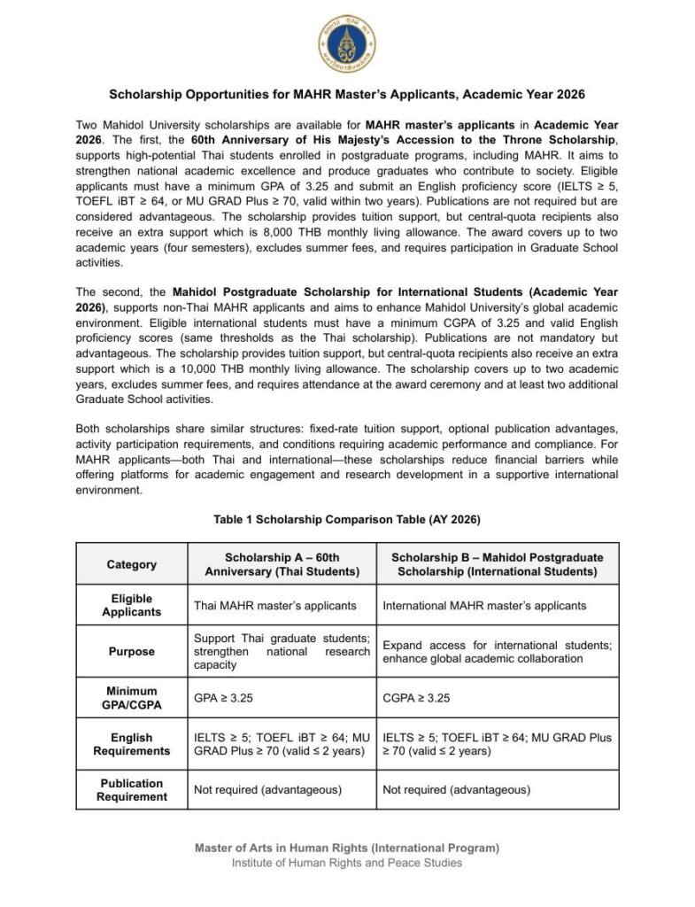 Mahidol တက္ကသိုလ် Institute of Human Rights and Peace Studies (IHRP) ကနေ ၂၀၂၆ ခုနှစ်မှာ တက်ရောက်မယ့် နိုင်ငံတကာ ကျောင်းသားတွေအတွက် စကောလားရှစ် အစီအစဉ်ရှိပါတယ်။